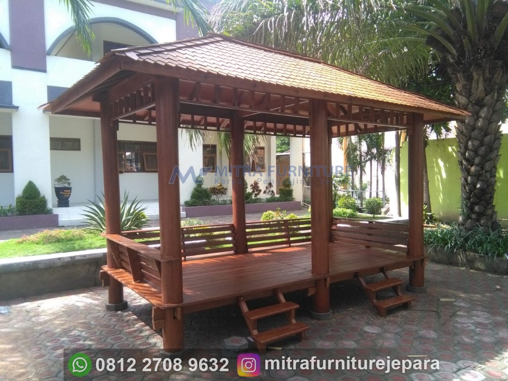 Salah satu pilihan populer adalah gazebo glugu Jepara ukuran 2×4 meter. Kayu glugu, yang berasal dari batang kelapa, memiliki serat unik dan nuansa tropis alami. Dengan sentuhan tangan pengrajin Jepara, gazebo ini bisa tampil sederhana atau bahkan dilengkapi ukiran, sesuai kebutuhan. Ukuran 2×4 meter menjadikannya pas untuk digunakan sebagai tempat berkumpul keluarga kecil maupun sebagai pelengkap gazebo taman di area outdoor.