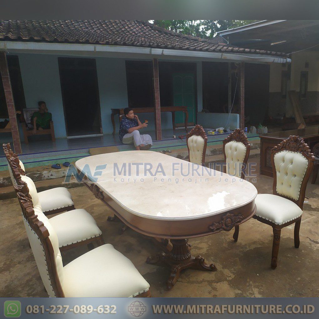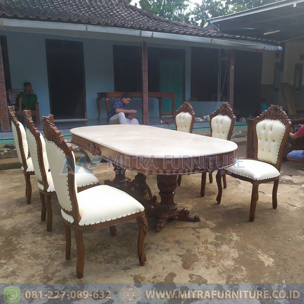Set meja makan oval mewah 6 kursi – Kayu jati atau solid merupakan salah satu material yang alami. Penggunaan material ini pada furniture rumah tangga ataupun dekorasi akan memberikan kesan mewah. Makanya banyak orang menginginkan produk yang terbuat dari bahan alami ini di rumah mereka. Selain itu harga jual kayu solid pun cukup tinggi dan membuatnya menjadi salah satu peluang bisnis yang cukup menjanjikan.